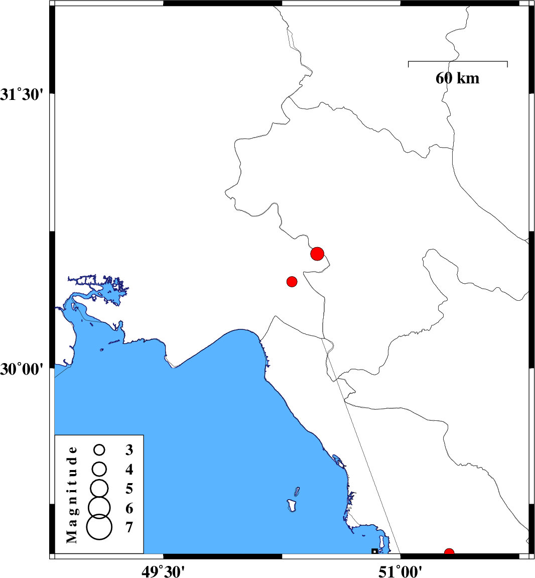 | 2016/03/03 | 16:21:59.9 | 19:51:59.9 | 28.975 | 51.307 | 6 | ML:2.8 | Bushehr Province, 12 km of Ahram |