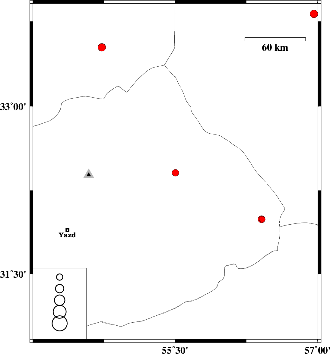 2016/02/17 | 07:08:39.4 | 10:38:39.4 | 33.817 | 56.961 | 15 | ML:3.7 | Yazd Province, 24 km North of Tabas |