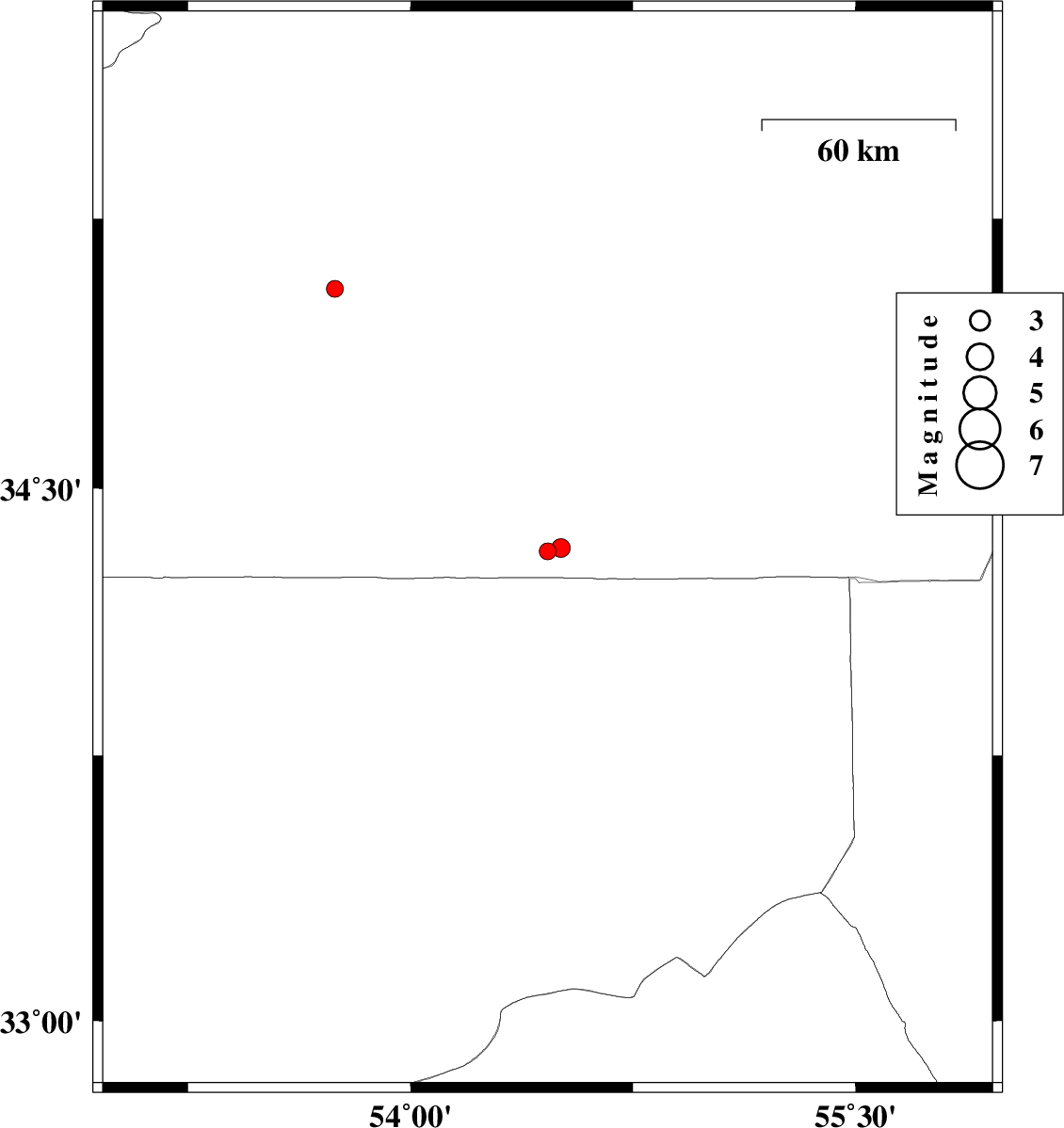| 2016/03/12 | 04:26:24.5 | 07:56:24.5 | 34.334 | 54.507 | 14 | ML:2.8 | Semnan Province, 204 km South-East of Damghan |