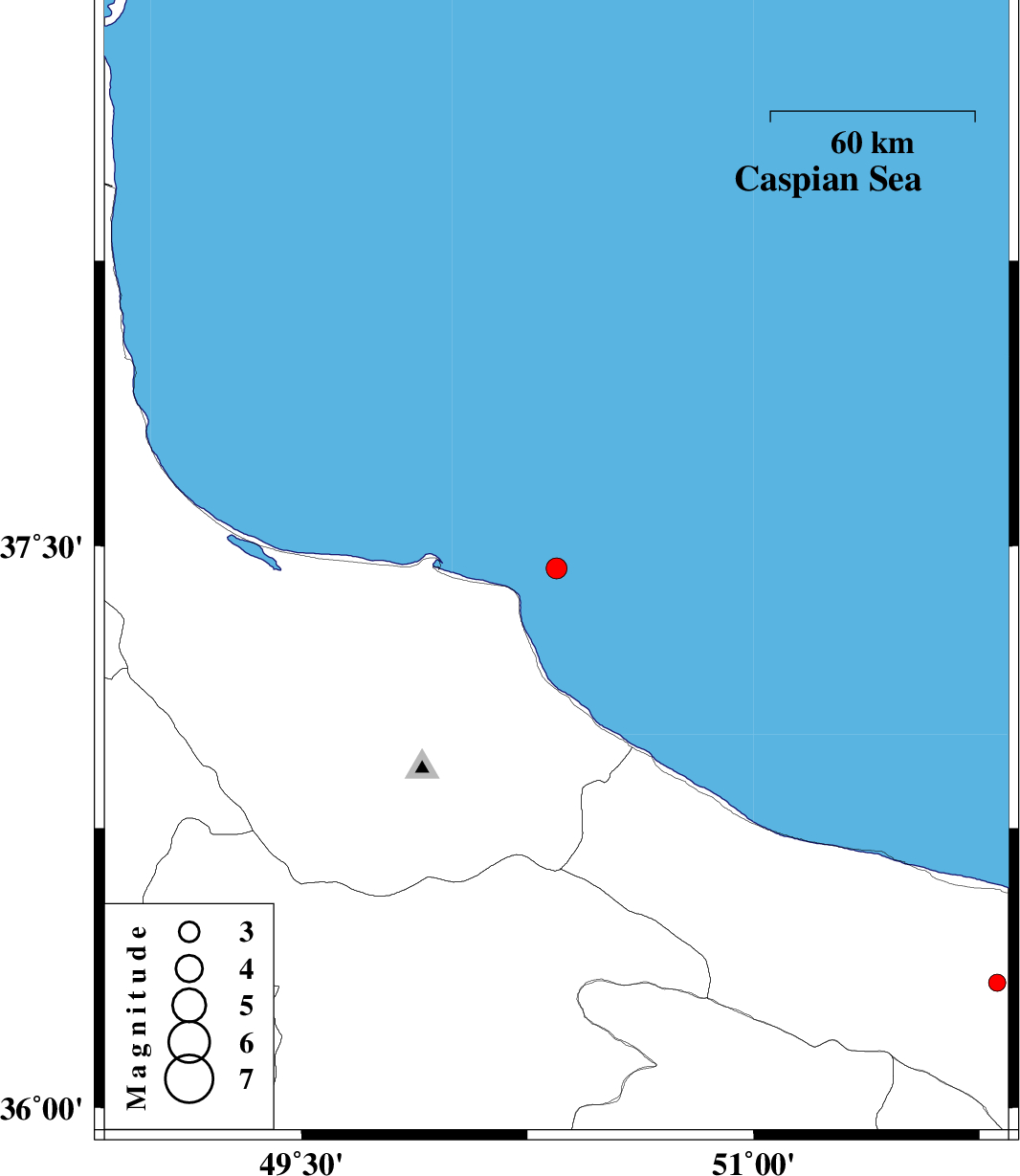 | 2016/04/06 | 10:16:15.7 | 14:46:15.7 | 37.441 | 50.346 | 14 | ML:3.1 | Caspian Sea, 34 km North of Rudsar | ||