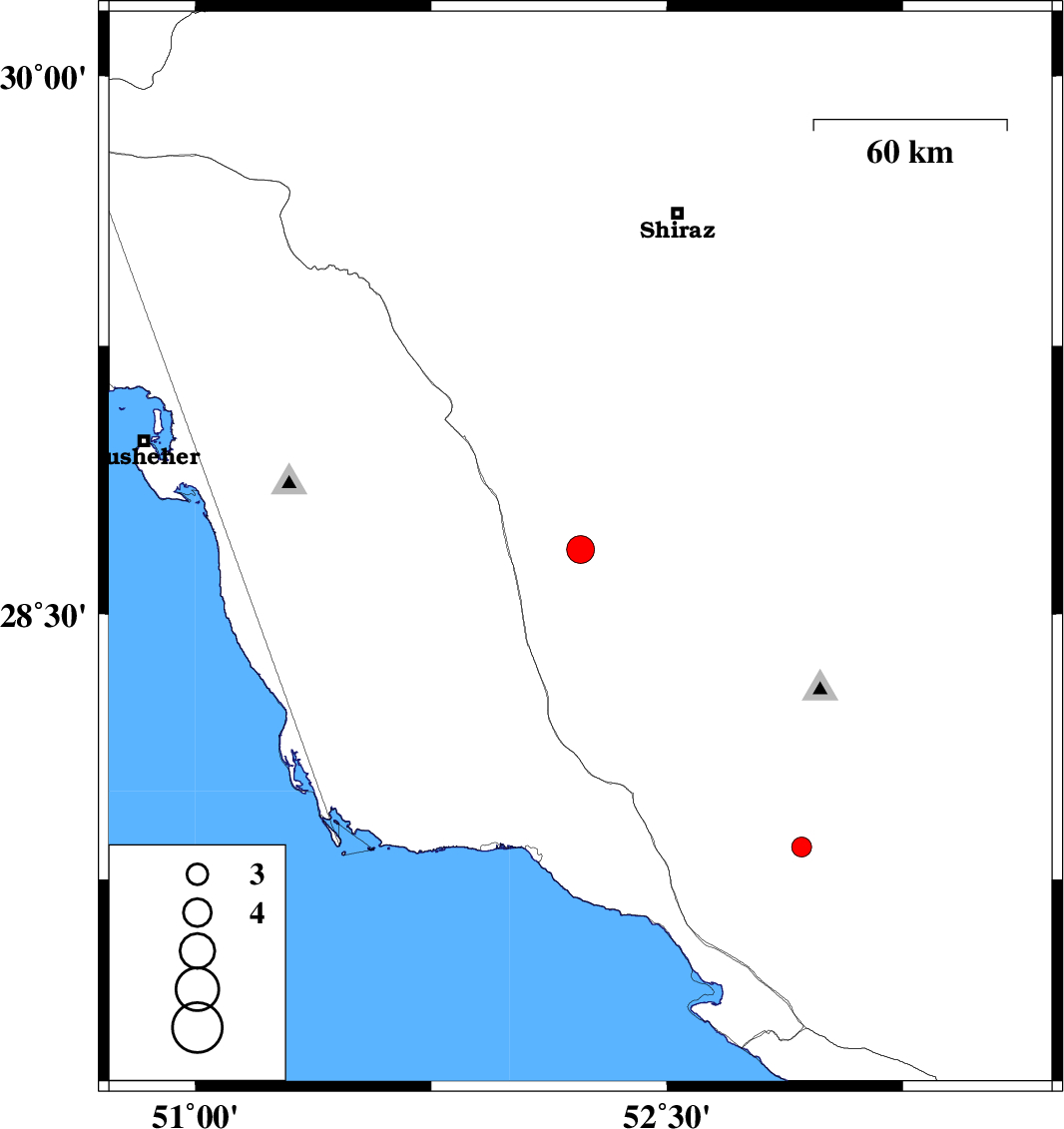 | 2016/04/08 | 07:57:21.3 | 12:27:21.3 | 27.842 | 52.928 | 17 | ML:2.8 | Fars Province, 33 km North of Mehr |