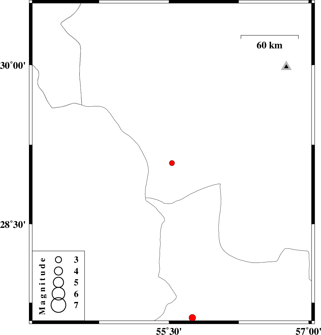 | 2016/03/19 | 10:29:46.0 | 13:59:46.0 | 29.077 | 55.532 | 14 | ML:2.5 | Kerman Province, 43 km South-West of Sirjan | ||