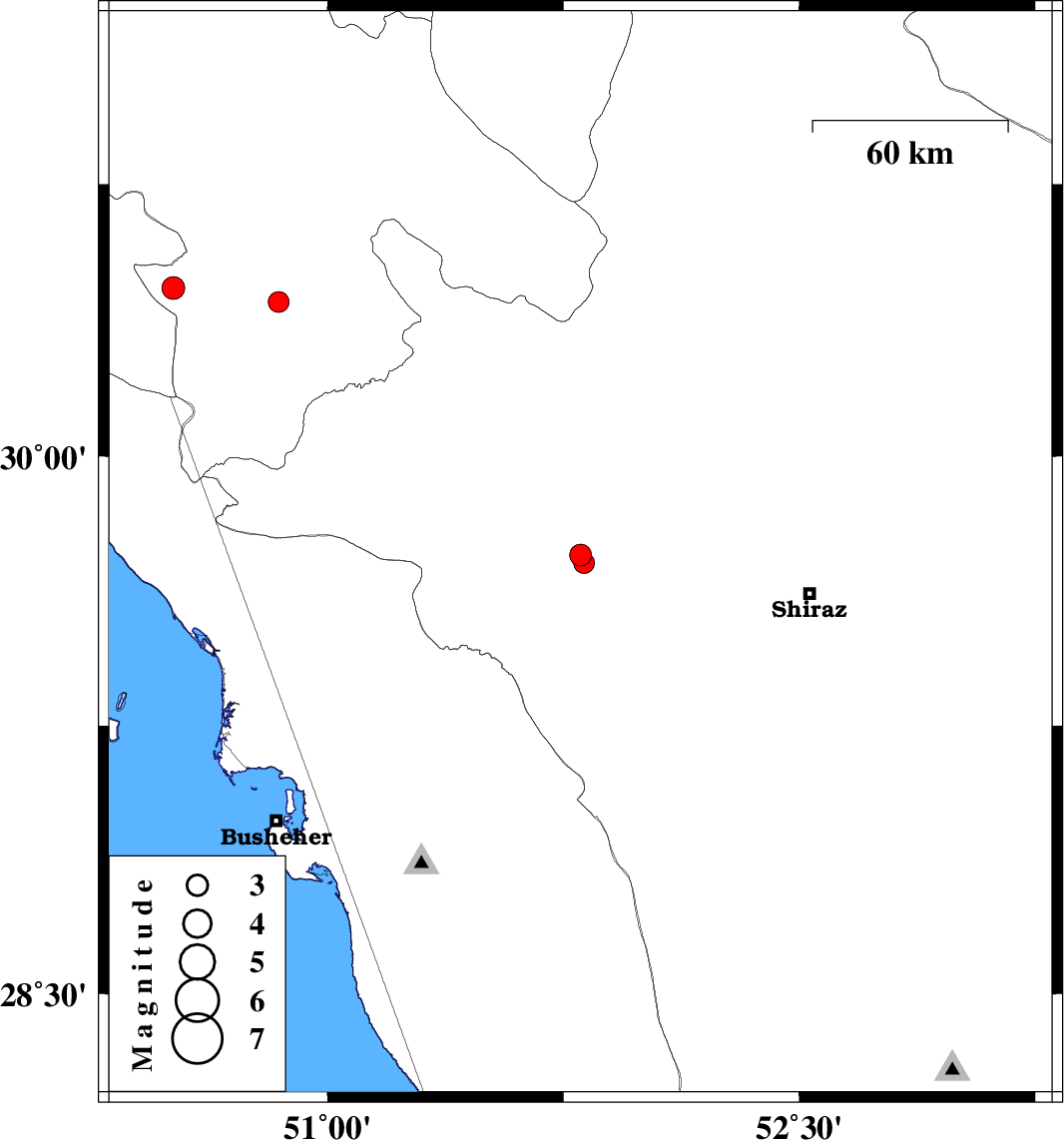 | 2016/05/01 | 23:48:01.6 | 04:18:01.6 | 29.703 | 51.815 | 12 | ML:3 | Fars Province, 18 km -East of Kazerun | ||