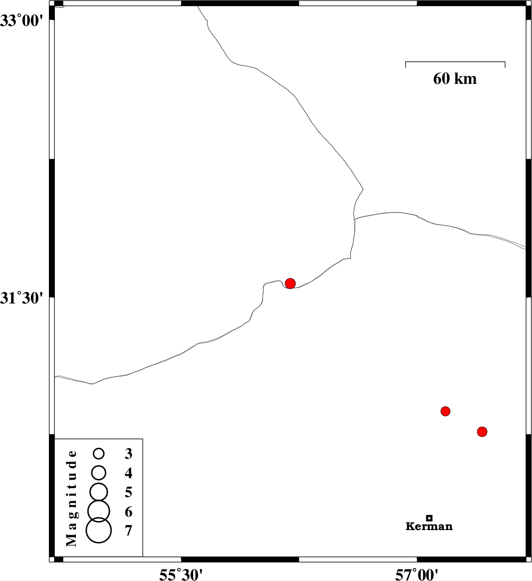 | 2016/05/13 | 10:54:55.6 | 15:24:55.6 | 30.763 | 57.415 | 14 | ML:2.8 | Kerman Province, 62 km North-East of Kerman | ||