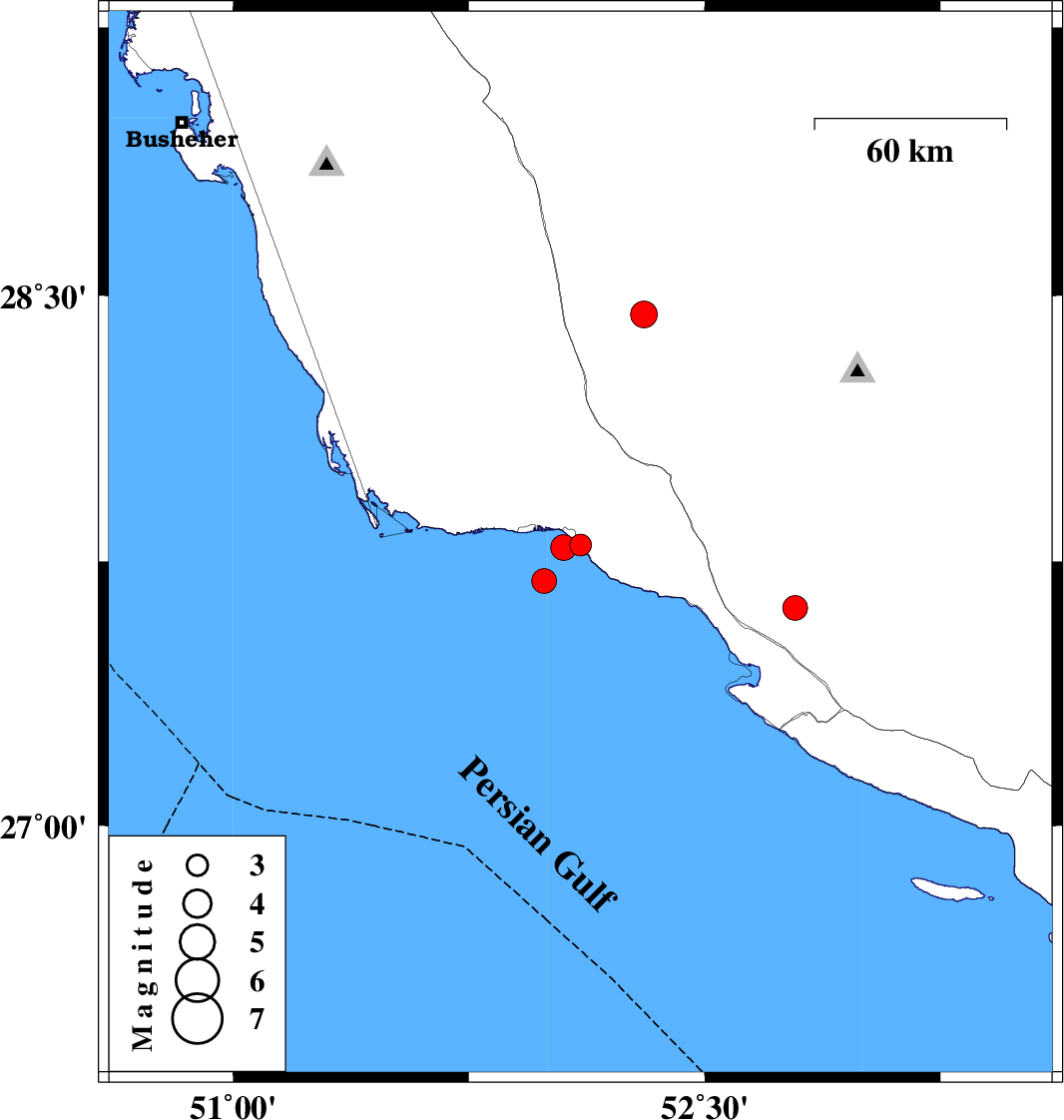 | 2016/05/10 | 00:05:42.8 | 04:35:42.8 | 27.789 | 52.052 | 15 | ML:3.7 | Persian Gulf, 4 km of Bandar-e kangan | ||