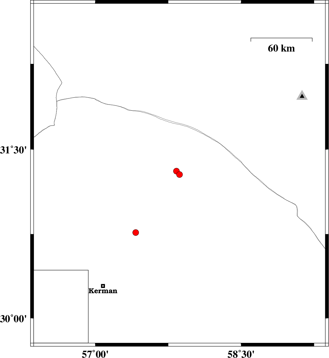| 2016/05/13 | 10:54:55.6 | 15:24:55.6 | 30.763 | 57.415 | 14 | ML:2.8 | Kerman Province, 62 km North-East of Kerman |