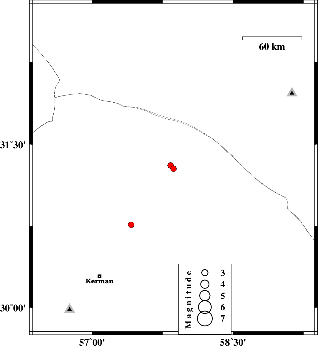 | 2016/05/15 | 20:15:04.8 | 00:45:04.8 | 31.308 | 57.835 | 14 | ML:2.8 | Kerman Province, 97 km -East of Ravar | ||
