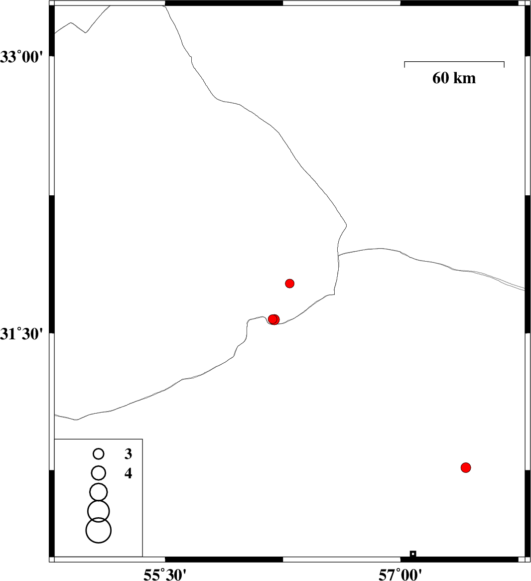 2016/05/13 | 10:54:55.6 | 15:24:55.6 | 30.763 | 57.415 | 14 | ML:2.8 | Kerman Province, 62 km North-East of Kerman |