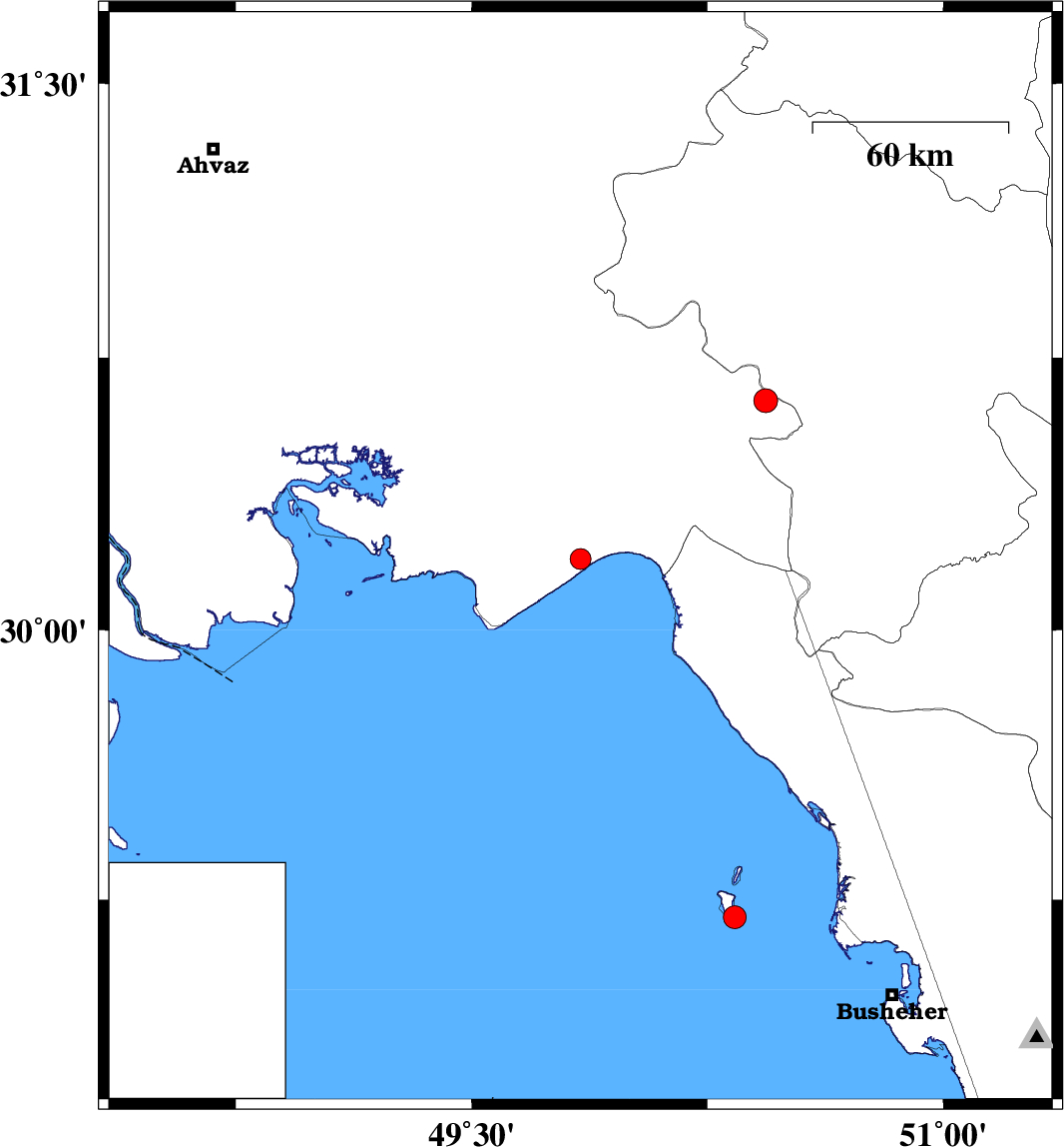 | 2016/05/22 | 07:32:22.2 | 12:02:22.2 | 29.202 | 50.336 | 6 | ML:3.2 | Persian Gulf, 45 km South-West of Bandar-e genaveh | ||
