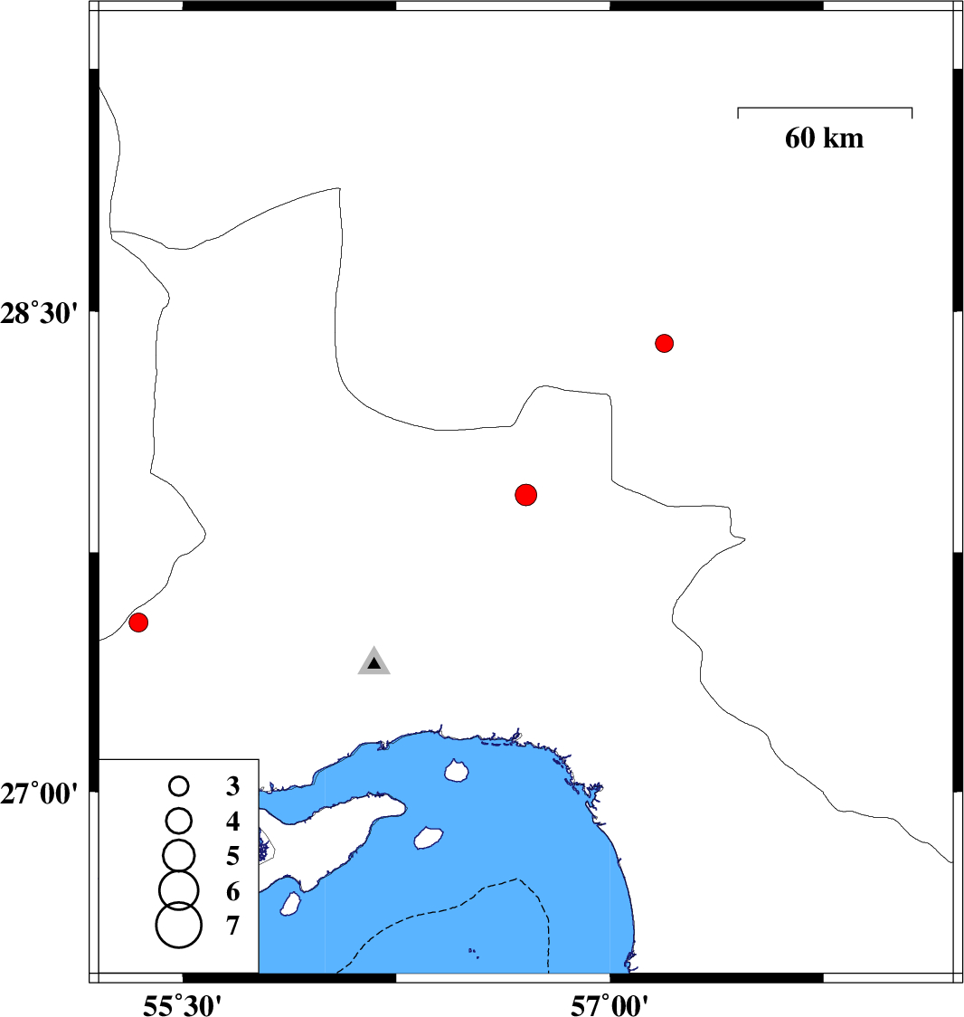 | 2016/06/07 | 15:25:33.9 | 19:55:33.9 | 27.531 | 55.344 | 15 | ML:2.9 | Hormozgan Province, 100 km South-East of Lar | ||