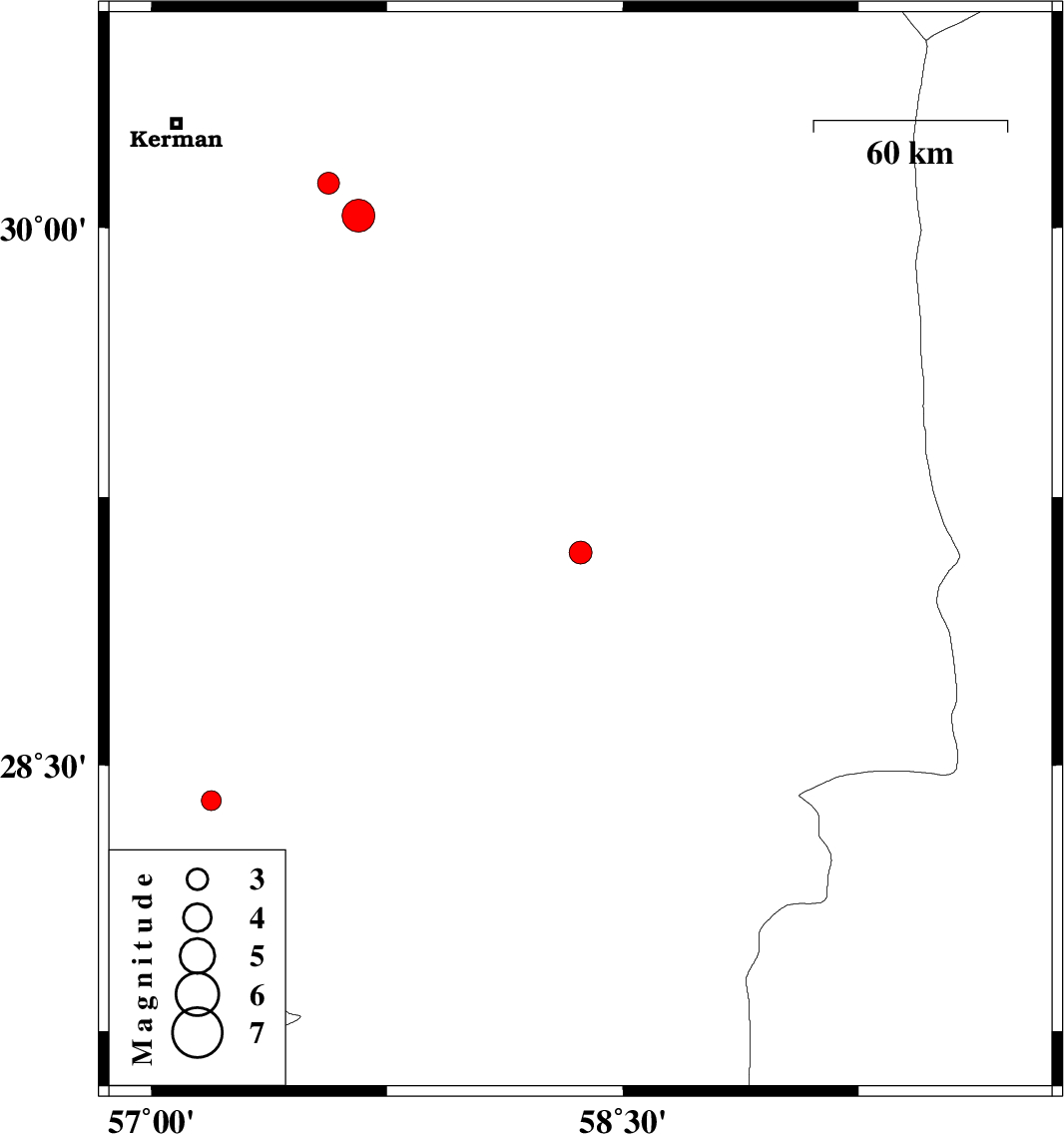 | 2016/06/06 | 17:40:07.5 | 22:10:07.5 | 30.123 | 57.563 | 14 | ML:3.1 | Kerman Province, 50 km South-East of Kerman | ||