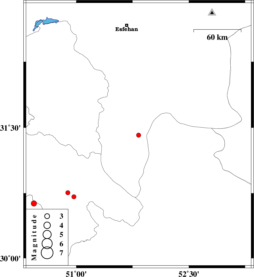 | 2016/06/10 | 19:12:32.5 | 23:42:32.5 | 31.415 | 51.83 | 14 | ML:2.7 | Esfahan Province, 24 km -East of Semirom | ||