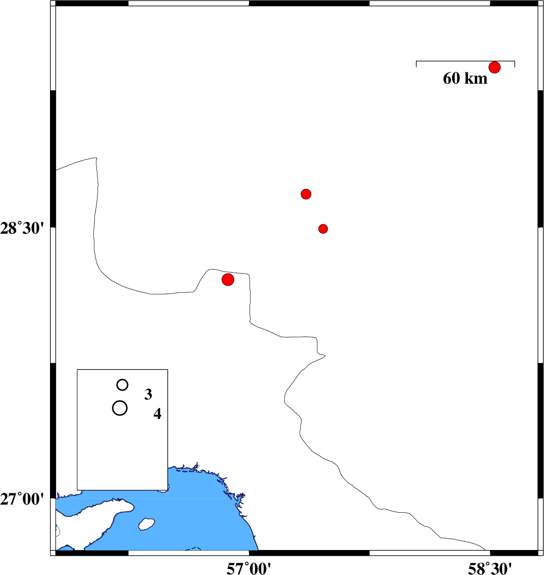 | 2016/06/10 | 02:26:22.4 | 06:56:22.4 | 28.209 | 57.297 | 15 | ML:2.6 | Kerman Province, 48 km North-West of Kahnuj | ||