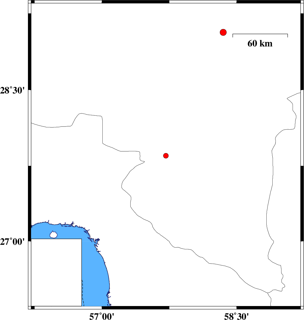 | 2016/06/20 | 03:58:18.2 | 08:28:18.2 | 27.85 | 57.712 | 15 | ML:2.6 | Kerman Province, 11 km South of Kahnuj | ||