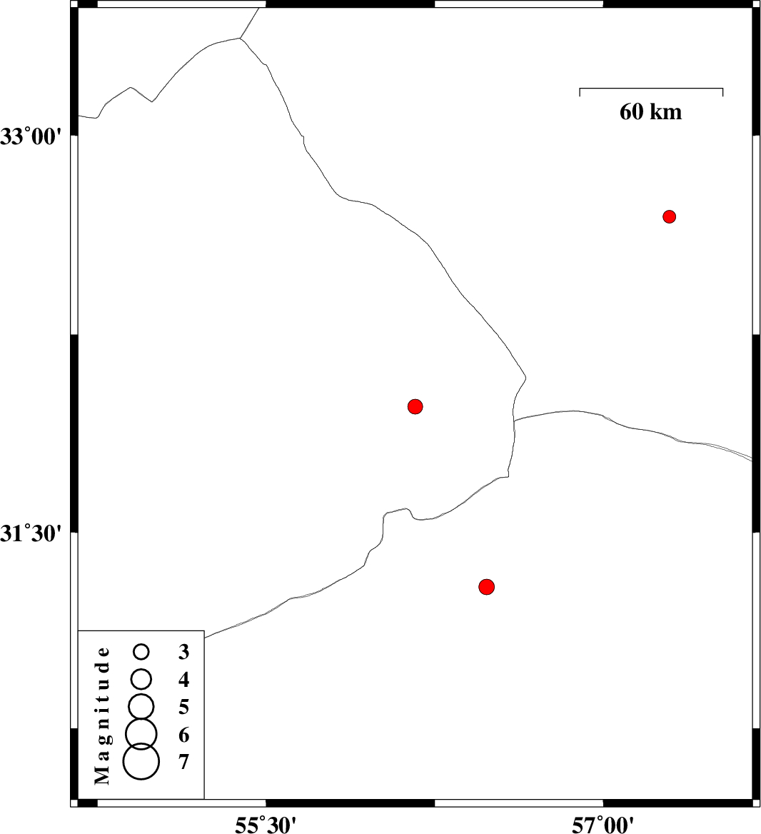 | 2016/06/18 | 09:42:17.2 | 14:12:17.2 | 32.694 | 57.293 | 16 | ML:2.5 | Yazd Province, 106 km South-East of Tabas |