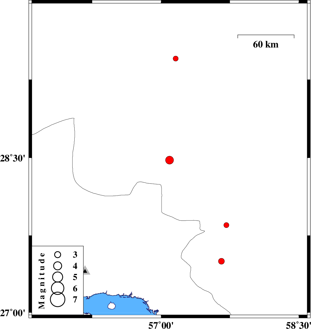 2016/06/20 | 03:58:18.2 | 08:28:18.2 | 27.85 | 57.712 | 15 | ML:2.6 | Kerman Province, 11 km South of Kahnuj |