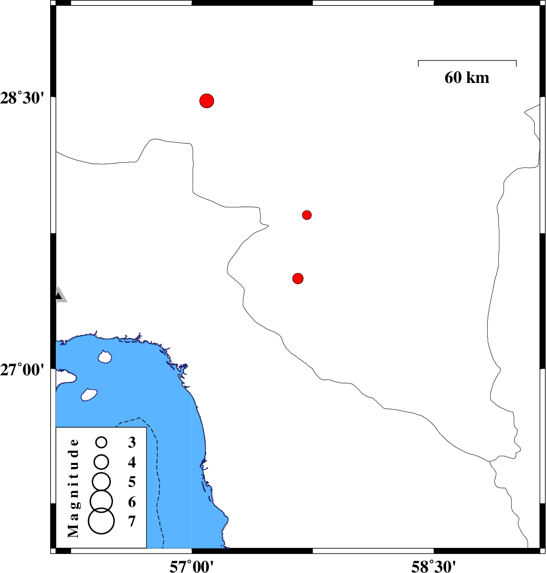 2016/06/20 | 03:58:18.2 | 08:28:18.2 | 27.85 | 57.712 | 15 | ML:2.6 | Kerman Province, 11 km South of Kahnuj |