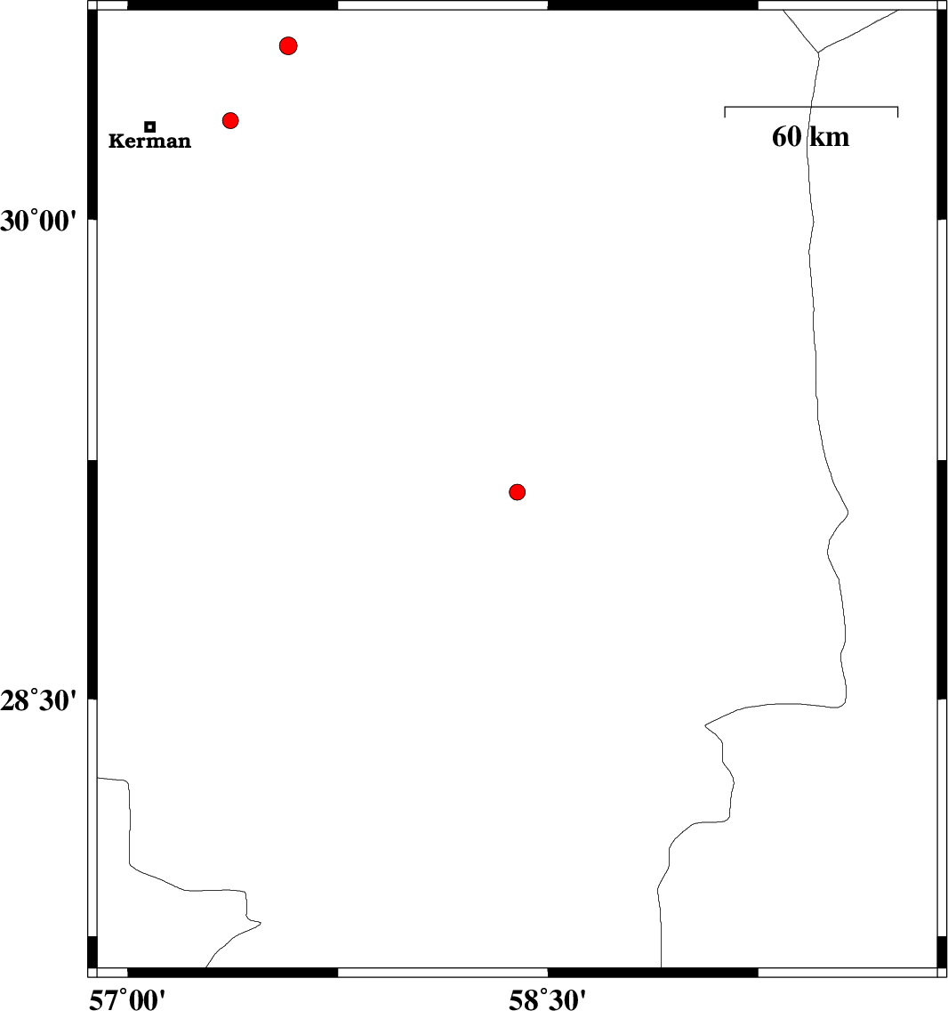 2016/06/30 | 00:41:39.2 | 05:11:39.2 | 30.307 | 57.366 | 14 | ML:2.6 | Kerman Province, 28 km -East of Kerman |