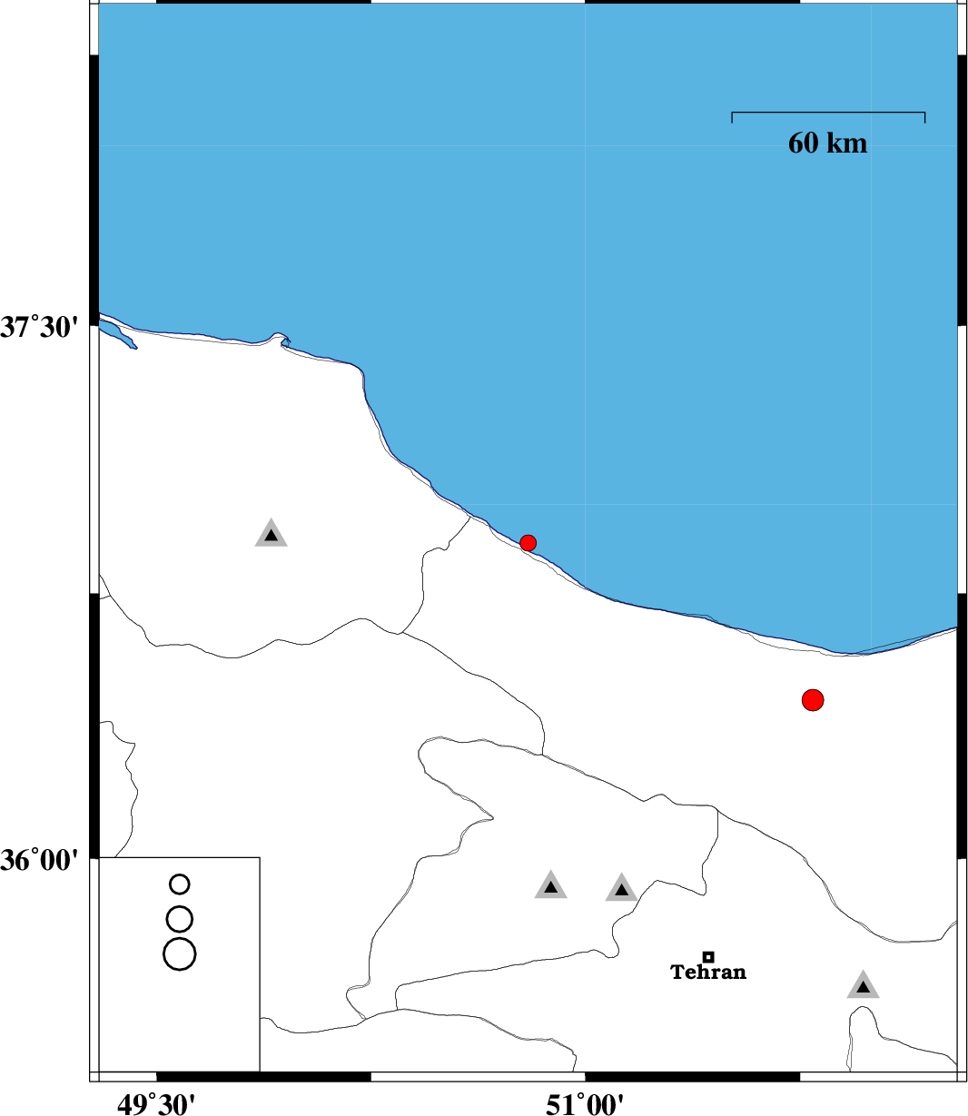 | 2016/07/08 | 17:32:46.3 | 22:02:46.3 | 36.892 | 50.799 | 14 | ML:2.6 | Caspian Sea, 14 km -East of Ramsar | ||