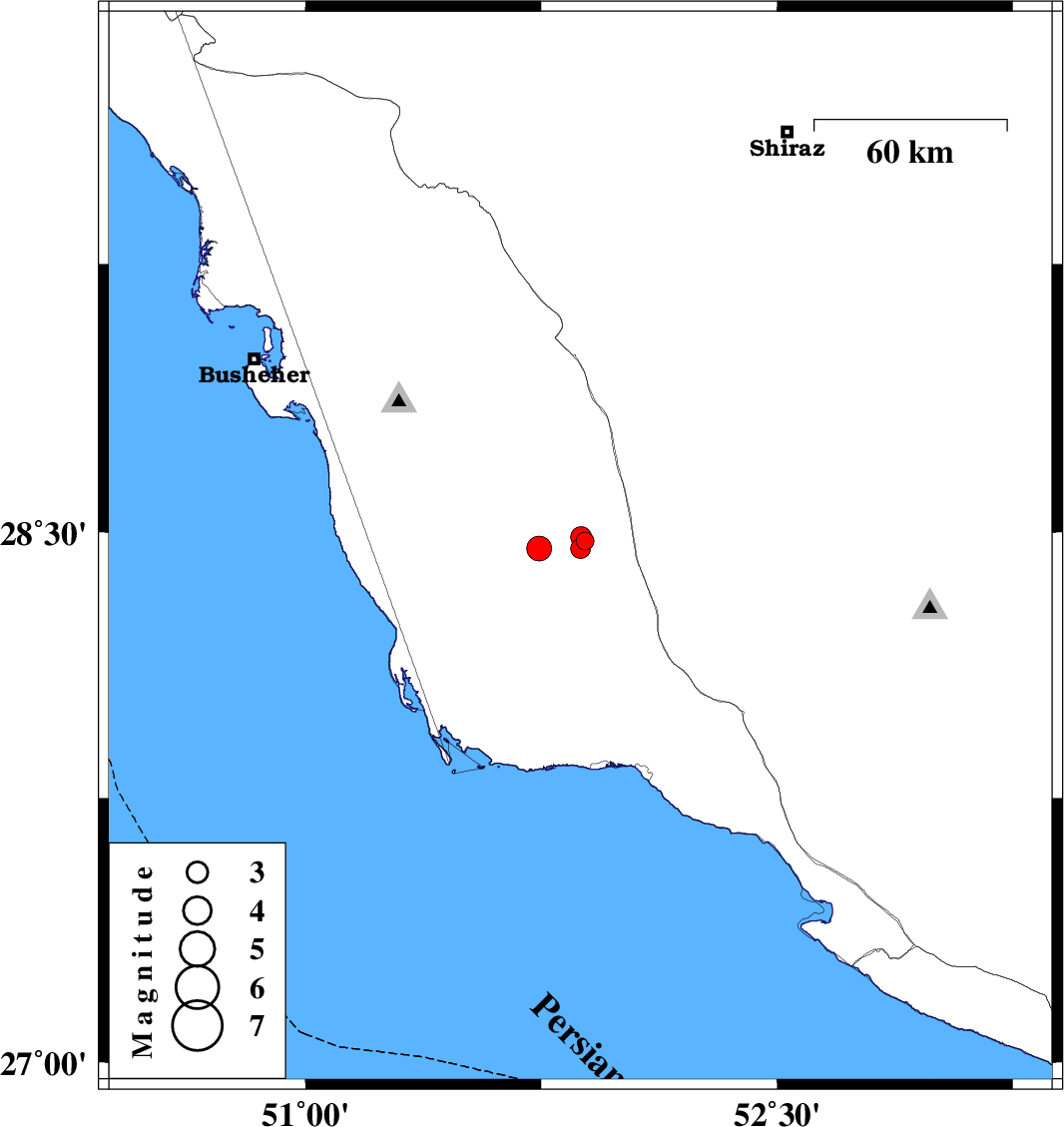 2016/07/10 | 22:51:27.8 | 03:21:27.8 | 28.453 | 51.875 | 22 | ML:2.8 | Bushehr Province, 51 km South-West of Farashband | ||