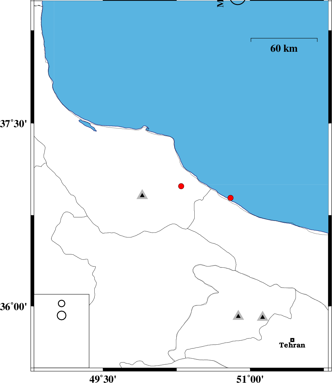 | 2016/07/08 | 17:32:46.3 | 22:02:46.3 | 36.892 | 50.799 | 14 | ML:2.6 | Caspian Sea, 14 km -East of Ramsar |