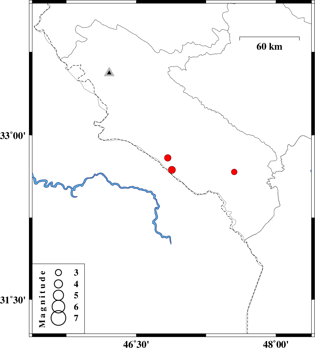 | 2016/07/15 | 17:27:54.5 | 21:57:54.5 | 32.794 | 46.838 | 14 | ML:3.3 | Ilam Province, 41 km North-West of Dehloran | ||