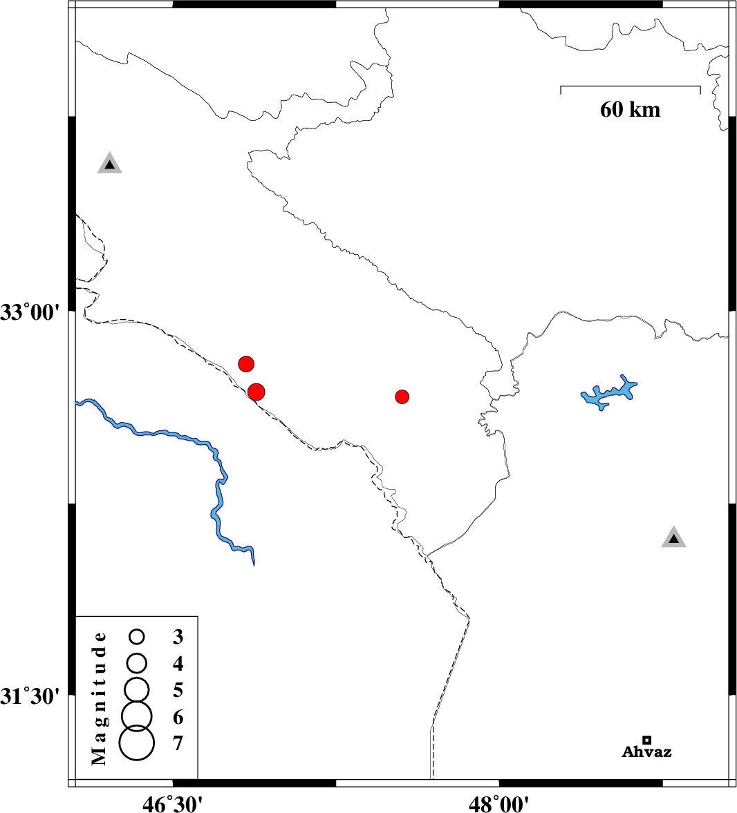 | 2016/07/15 | 17:20:15.1 | 21:50:15.1 | 32.685 | 46.883 | 14 | ML:3.5 | Ilam Province, 35 km -West of Dehloran | ||