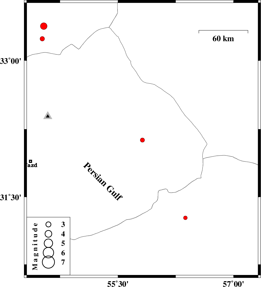 2016/07/06 | 09:01:32.1 | 13:31:32.1 | 33.376 | 54.539 | 6 | ML:3.9 | Esfahan Province, 127 km North-East of Ardakan |
