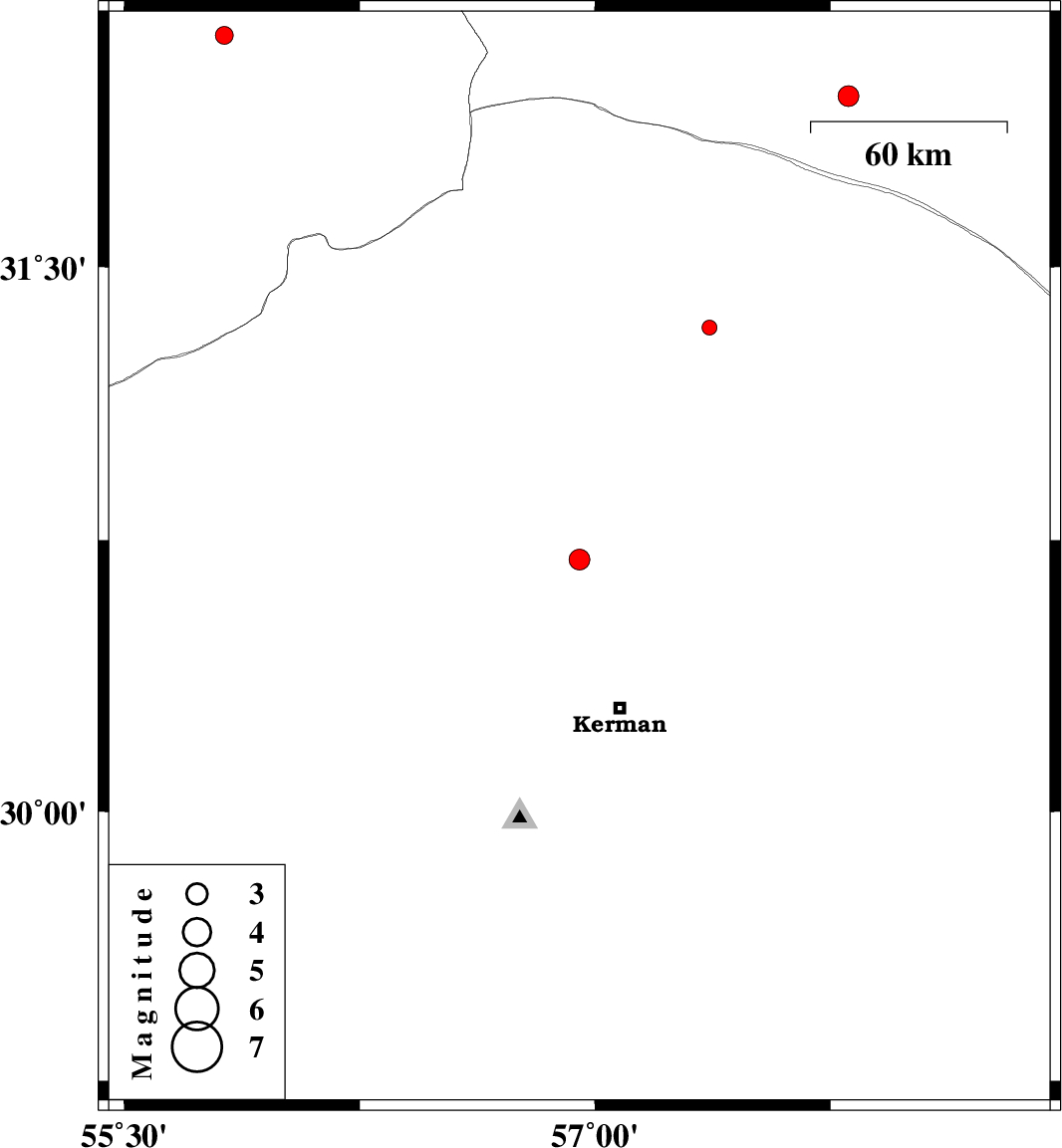 | 2016/07/19 | 22:47:40.1 | 03:17:40.1 | 30.697 | 56.95 | 14 | ML:3 | Kerman Province, 39 km South-East of Zarand | ||