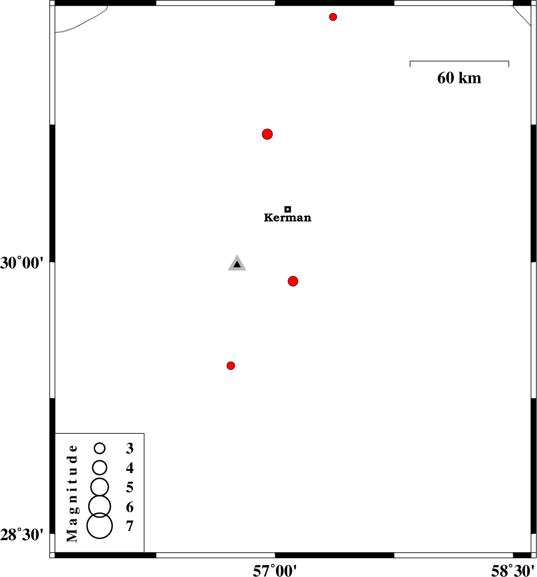| 2016/07/22 | 02:44:47.2 | 07:14:47.2 | 29.895 | 57.112 | 14 | ML:2.8 | Kerman Province, 44 km South of Kerman | ||