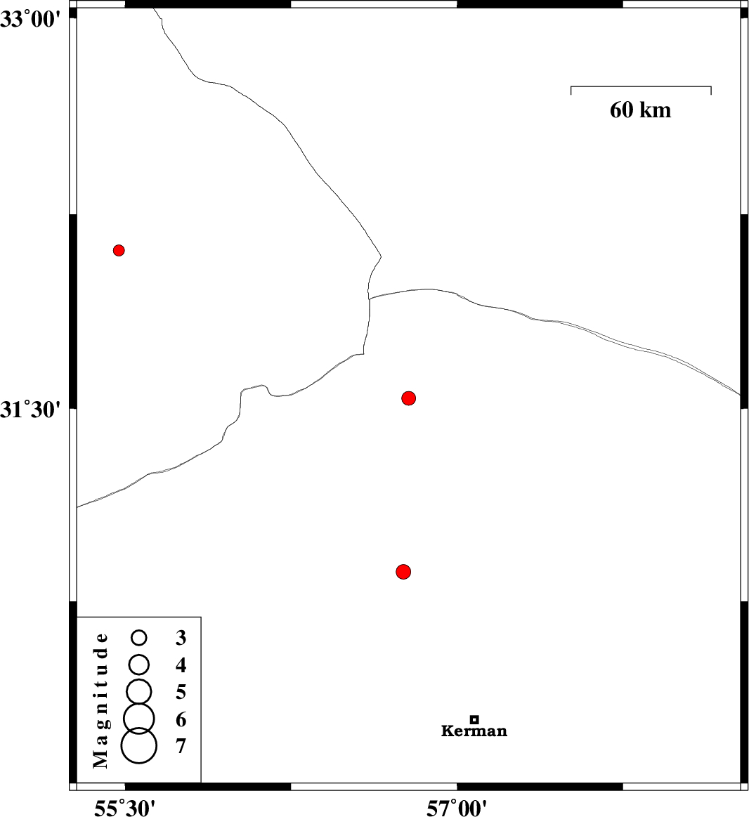 | 2016/08/06 | 04:12:01.5 | 08:42:01.5 | 30.865 | 56.758 | 14 | ML:3 | Kerman Province, 19 km -East of Zarand | ||