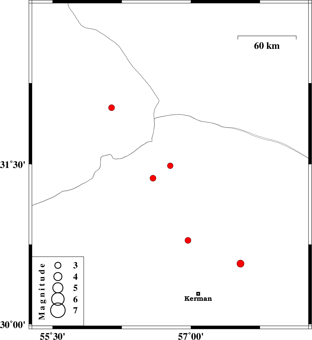 | 2016/08/29 | 00:57:54.9 | 05:27:54.9 | 30.789 | 56.968 | 14 | ML:3 | Kerman Province, 38 km -East of Zarand | ||