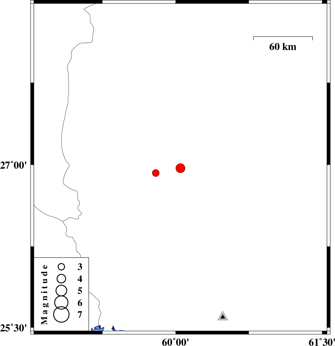 | 2016/09/21 | 07:41:13.1 | 11:11:13.1 | 26.968 | 60.049 | 16 | ML:4.2 | Sistan va Baloochestan Province, 70 km South-West of Iranshahr |