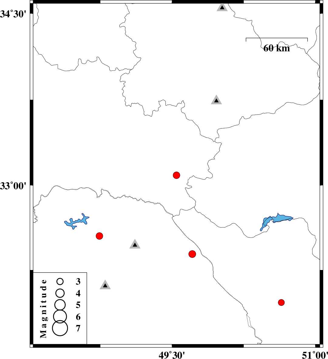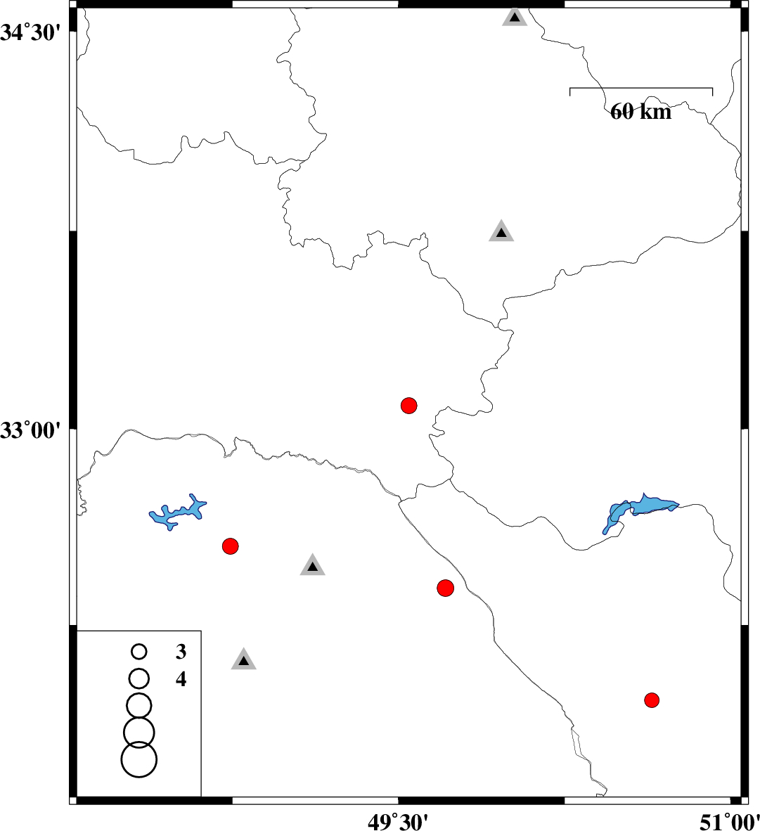 | 2016/09/25 | 08:21:43.5 | 11:51:43.5 | 33.088 | 49.547 | 14 | ML:3.2 | Lorestan Province, 41 km South of Azna | ||