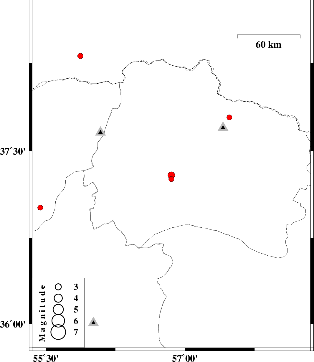 | 2016/09/17 | 02:23:34.5 | 06:53:34.5 | 37.788 | 57.479 | 14 | ML:2.5 | Khorasan(north) Province, 37 km North-East of Bojnurd |