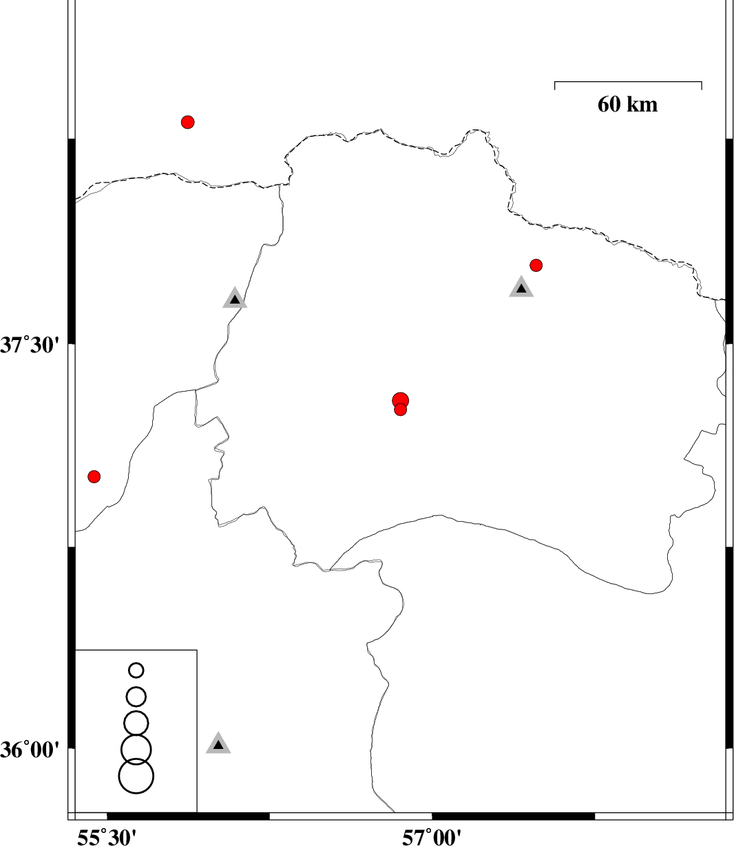 2016/10/04 | 13:16:18.5 | 16:46:18.5 | 37.258 | 56.853 | 15 | ML:2.6 | Khorasan(north) Province, 33 km South of Ashkhaneh | ||