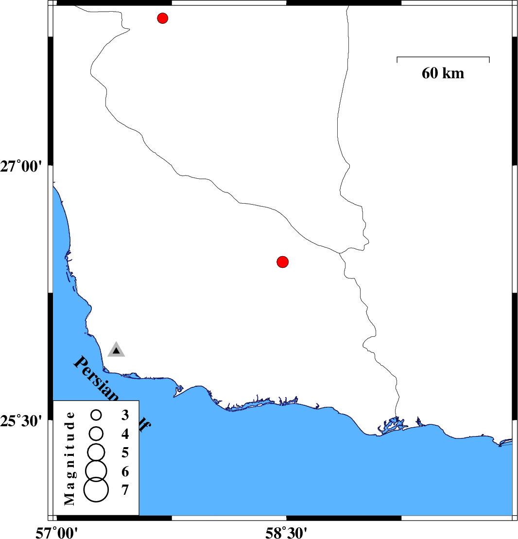 | 2016/10/02 | 02:39:35.8 | 06:09:35.8 | 27.856 | 57.69 | 16 | ML:3.1 | Kerman Province, 10 km of Kahnuj |
