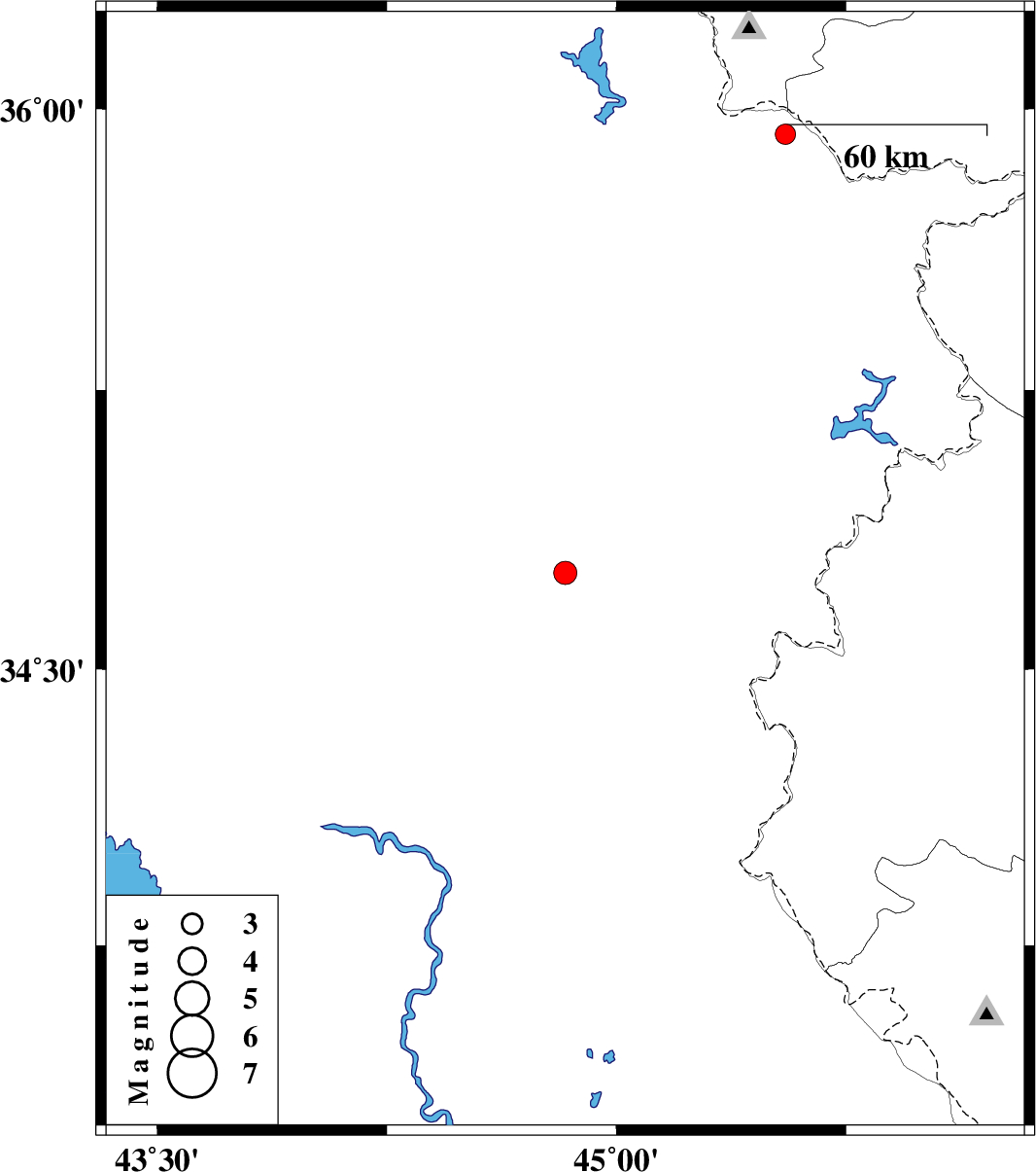 | 2016/10/15 | 14:43:32.8 | 18:13:32.8 | 35.932 | 45.552 | 14 | ML:3 | Iraq, 26 km South of Sardasht |