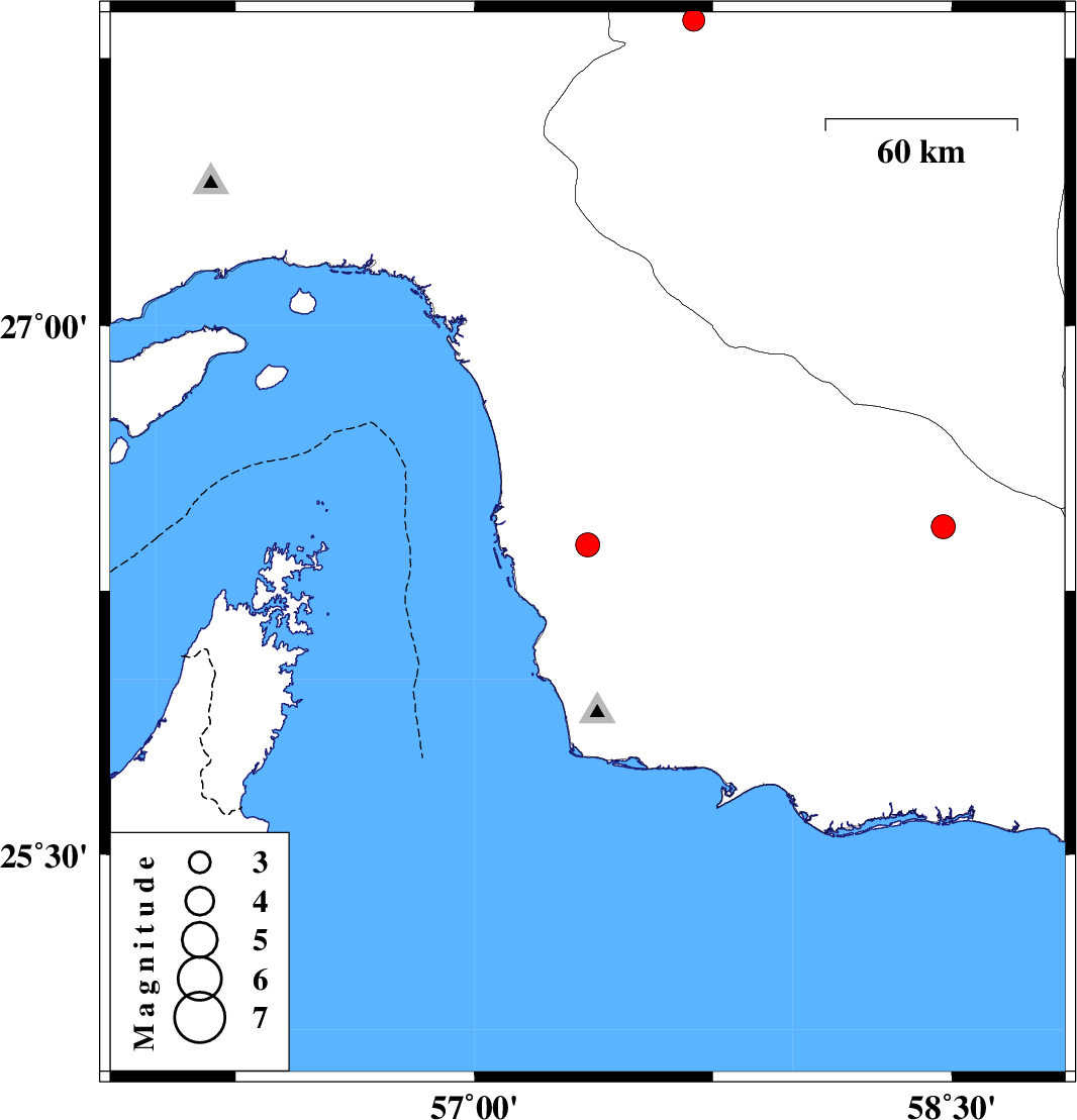 | 2016/10/22 | 22:42:58.1 | 02:12:58.1 | 26.381 | 57.356 | 15 | ML:3.4 | Hormozgan Province, 90 km South-East of Minab | ||
