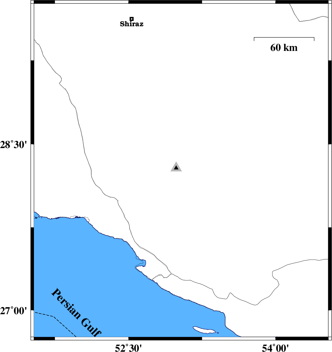2016/10/25 | 12:34:20.5 | 16:04:20.5 | 28.256 | 53.037 | 18 | ML:3.2 | Fars Province, 23 km South of Qir va Karzin | ||