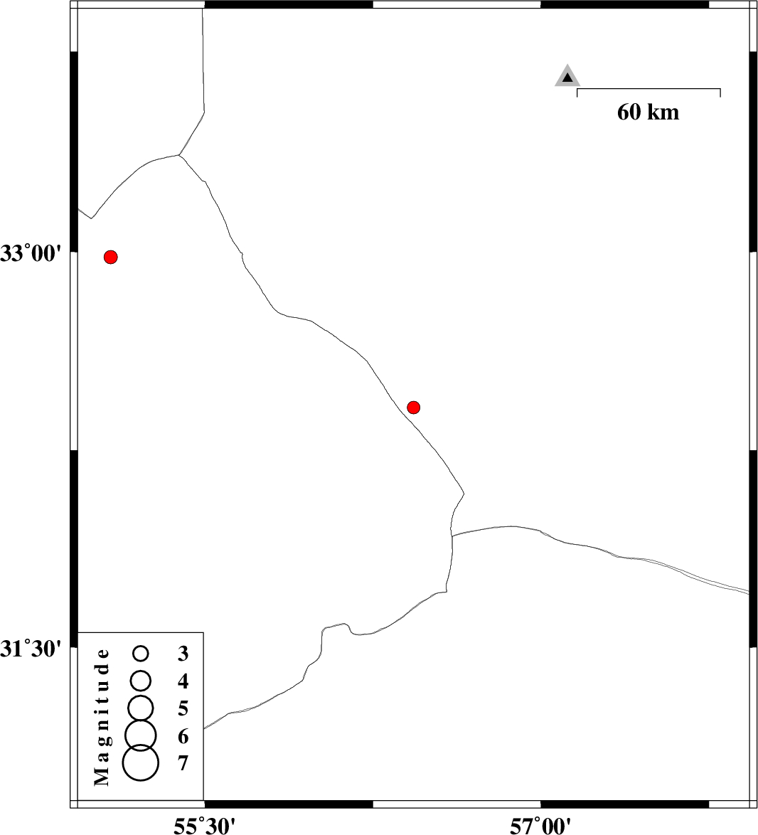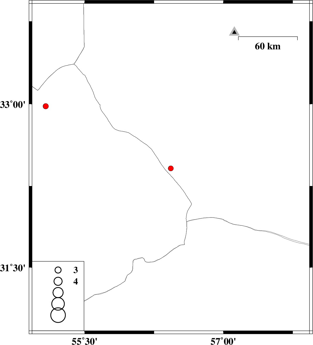 | 2016/10/31 | 09:06:33.6 | 12:36:33.6 | 32.98 | 55.078 | 11 | ML:2.7 | Yazd Province, 156 km North-West of Bafq | ||
