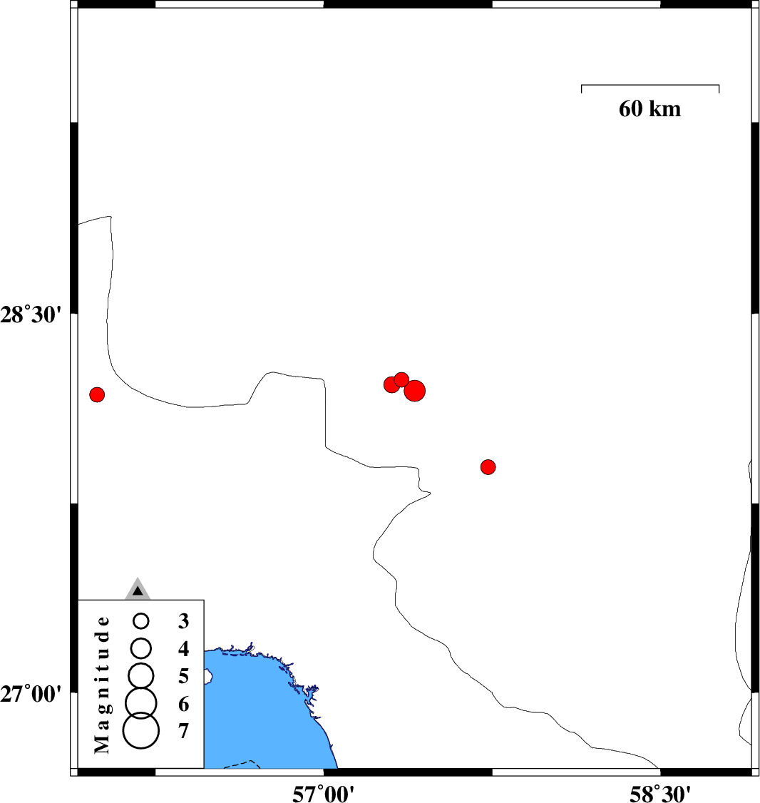 | 2016/11/09 | 01:05:30.1 | 04:35:30.1 | 28.22 | 57.303 | 15 | ML:3.2 | Kerman Province, 49 km North-West of Kahnuj | ||