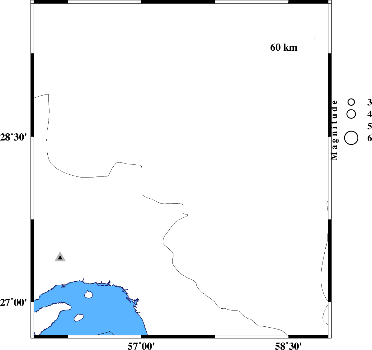 | 2016/11/09 | 01:26:56.1 | 04:56:56.1 | 28.24 | 57.346 | 15 | ML:3 | Kerman Province, 47 km North-West of Kahnuj | ||