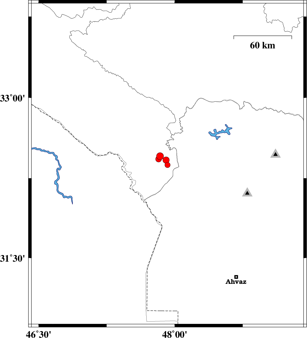 | 2016/11/11 | 07:08:51.9 | 10:38:51.9 | 32.374 | 47.921 | 14 | ML:2.7 | Ilam Province, 45 km -West of Dezful | ||