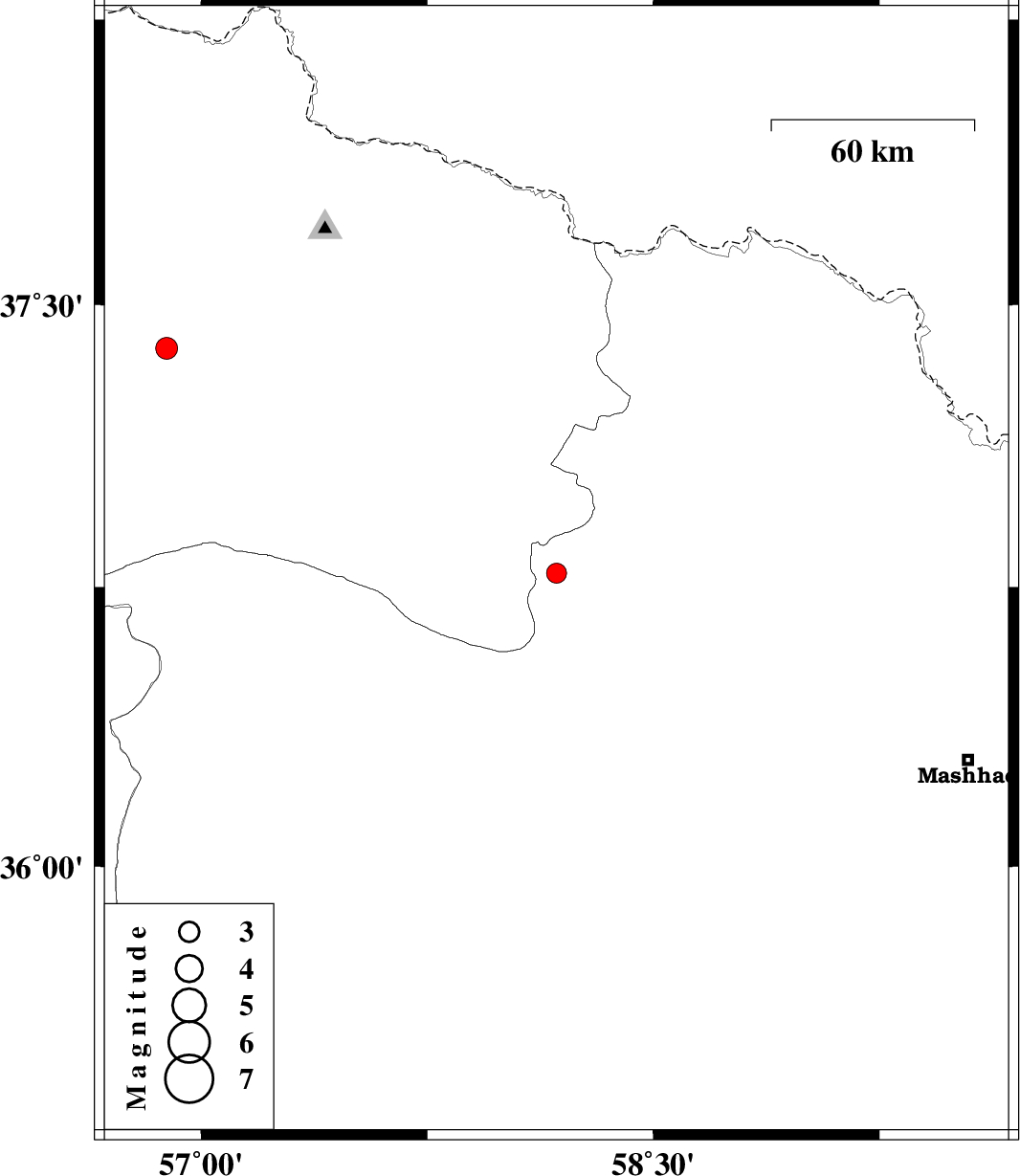 | 2016/12/09 | 15:41:22.4 | 19:11:22.4 | 36.787 | 58.179 | 15 | ML:2.9 | Khorasan(center) Province, 46 km South-West of Quchan | ||