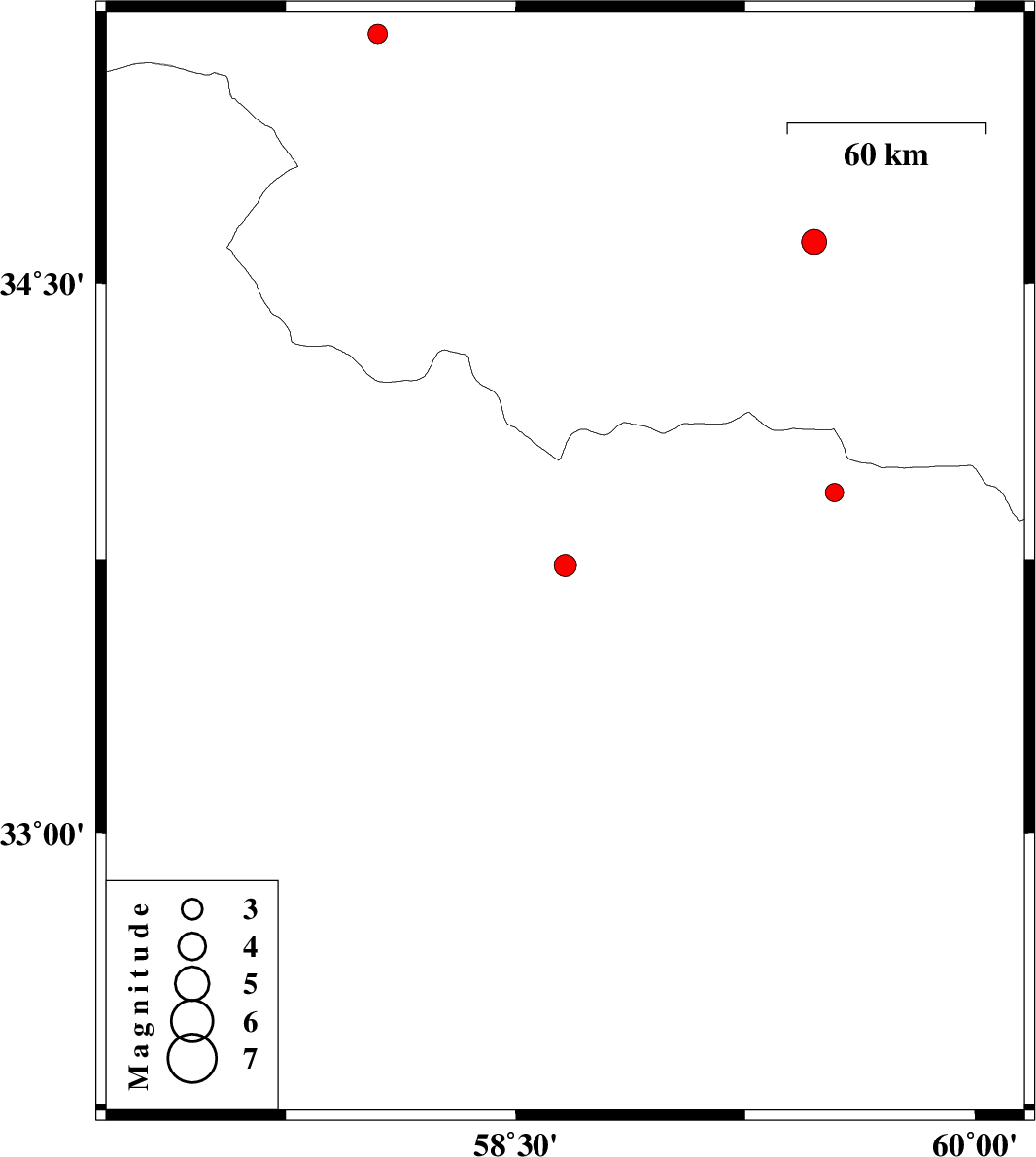 2016/11/23 | 13:01:51.7 | 16:31:51.7 | 33.932 | 59.541 | 12 | ML:2.7 | , 38 km North-East of Qaen | ||