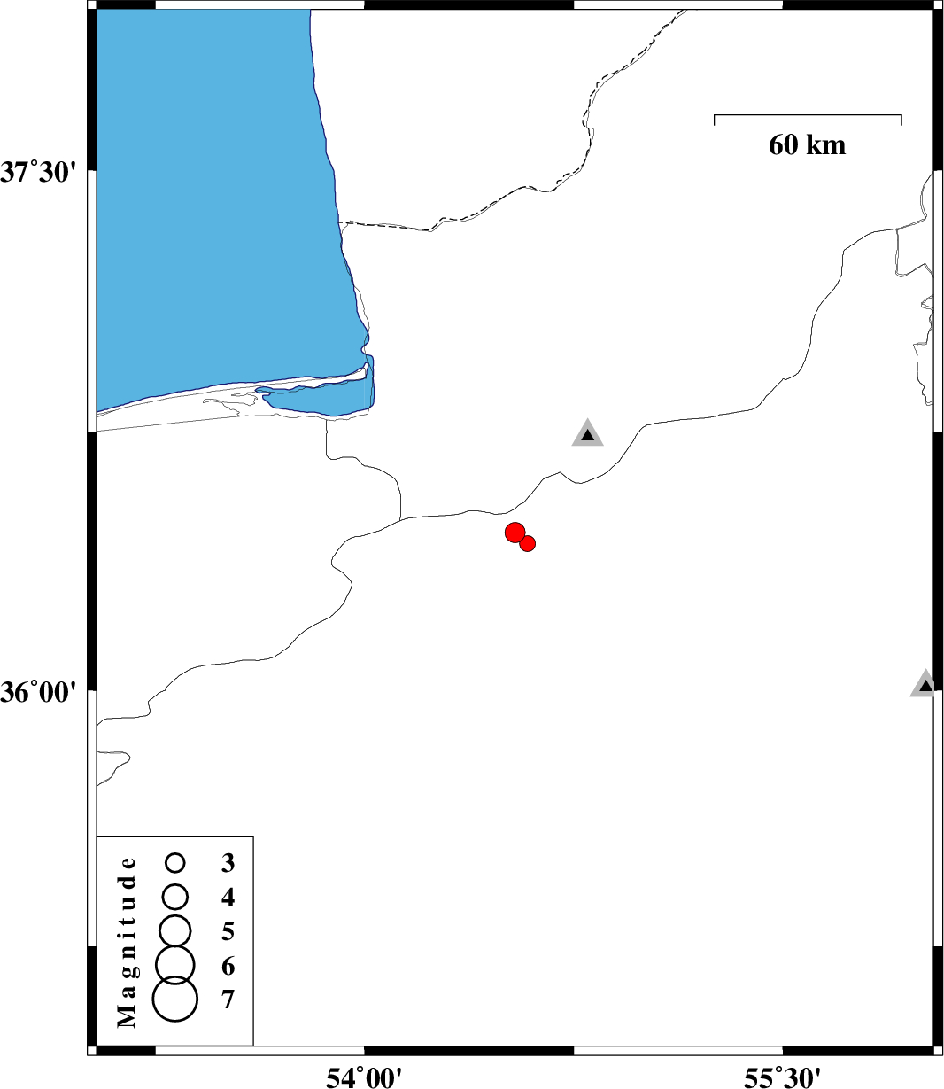 | 2016/12/23 | 22:59:07.2 | 02:29:07.2 | 36.457 | 54.539 | 14 | ML:3.2 | Semnan Province, 39 km -West of Shahrud | ||