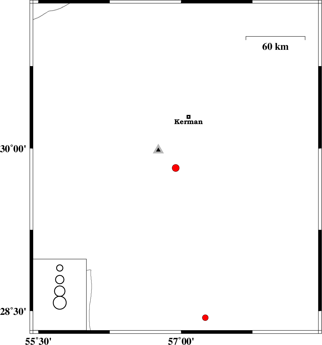| 2017/01/04 | 18:30:43.9 | 22:00:43.9 | 29.819 | 56.943 | 5 | ML:3.4 | Kerman Province, 37 km South-East of Bardsir | ||