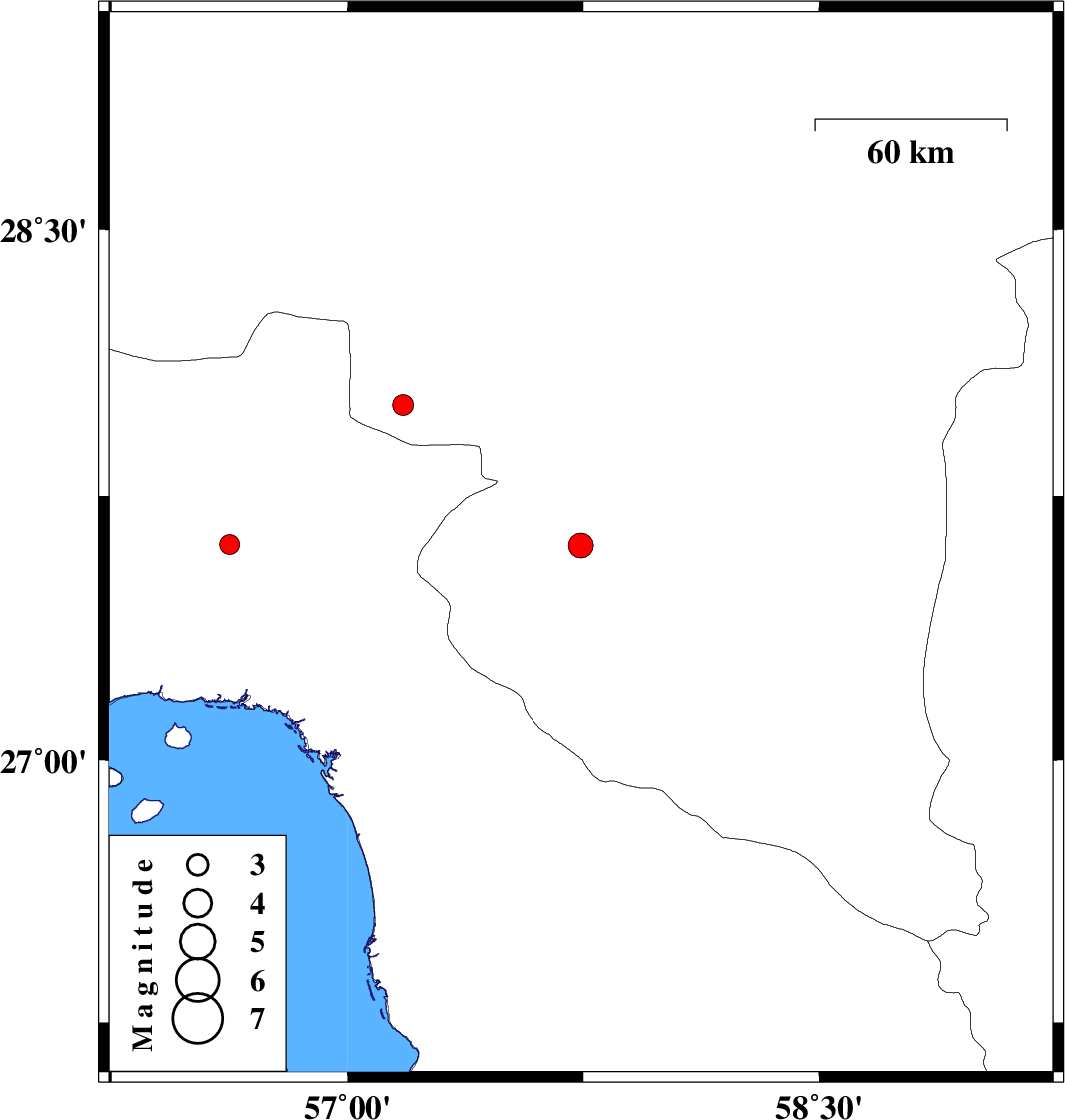 | 2017/01/13 | 10:07:21.3 | 13:37:21.3 | 27.61 | 57.742 | 14 | ML:3.5 | Kerman Province, 38 km South of Kahnuj | ||