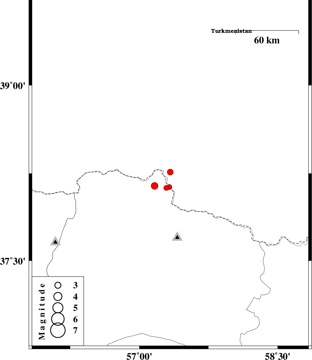 | 2017/01/29 | 10:08:31.1 | 13:38:31.1 | 38.262 | 57.335 | 11 | ML:2.9 | Turkmenistan, 88 km North of Bojnurd | ||